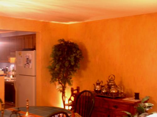 ![]() I was so wound up about this unexpected brick-rust base color that I got up at 3am to go down and check it out; just couldn't sleep. Well, it looked great but it was really red so I wonder how the second wash on - which is a rich Tuscan mustard-gold - will look over that. Anyway, up early and tested a small area area with a 50% cut of the mustard-gold and it was h-o-r-r-a-b-l-e. It looked like mud. It was awful! I got all pissed off and complained about the whole "red" look to the rooms, but Marissa thougth they looked really good. Well, the work was really good, but I was totally disappointed about the color. So I stormed out of the house threatening to return with a couple of gallons of white paint and start over. But when I got back, I thought I'd try washing-on the mustard-gold full strength rather than cutting it and if that didn't work then I'd just cover everything with the mustard-gold as a new base and then wash-on the brick-rust as the second application. I did a large section with the full strength mustard-gold and it looked really nice; exactly the "old feel&quo; look I was looking for. Unfortunately, because of the full strength application, I was only able to cover 4' of wall per hour vs the over 6' with the half cut finish. I worked until I was sick of it and then took Marissa to dinner, rented a couple of movies, and just "vegged out" for the evening. |