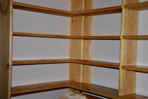 Steve's design was pretty unique. He built rails that he attatched to the walls, and then made interlocking rails on the backs of the shelves. He did this as it's very difficult in old homes like this to find support beams at regular distances to attatch things to.