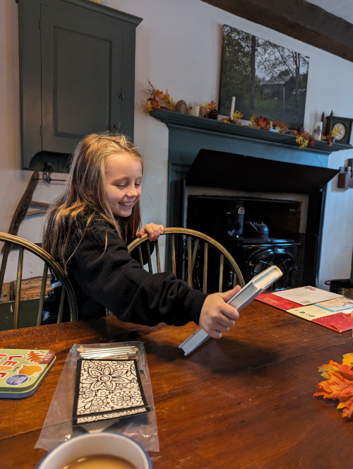 We picked Mia up Friday 11/10/23 just to spend the day with us. Sue thought she would enjoy hanging out and doing a couple of craft projects, and gave her the next book in the series that she enjoys, which is what she's looking at in the picture.