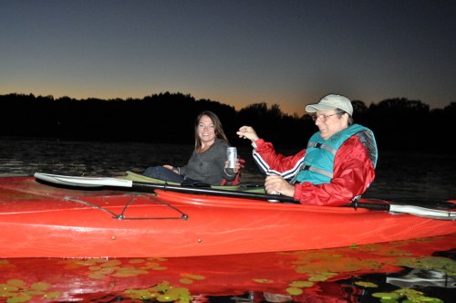 We beached the kayaks, broke out the sandwiches and some beer and had a grand time until 7:45pm when the sun started to drop. We got back into the kayaks and paddled all over the place as the full moon rose over the pond.