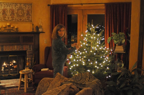After putting the snowshoes, poles, and other gear away, I got a fire going in the fireplace. I put Sue's Jim Brickman Christmas CD on, and we listed to that as we strung some lights on the tree and placed a few other decorations around.