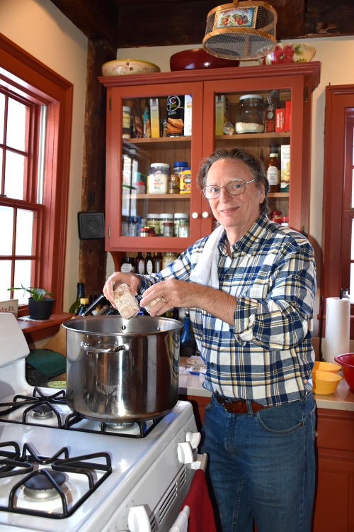 Once I got the ox tails simmering in the sauce, we had a chance to play a few sets of backgammon to start the New Year off. I'd get up every so often to stir the ox tails and throw another log into the wood stove, and refresh our wine. Beau just parked it on the floor by the wood stove. I think he was pretty worn out from the morning hike.